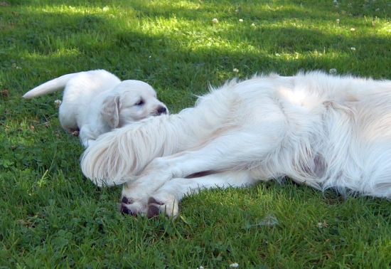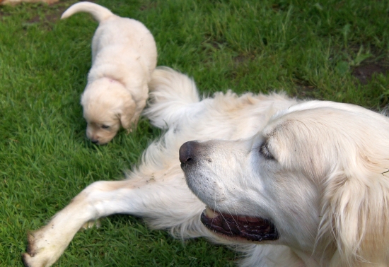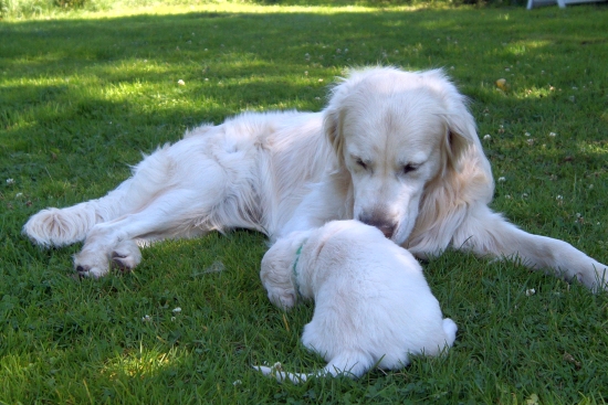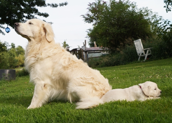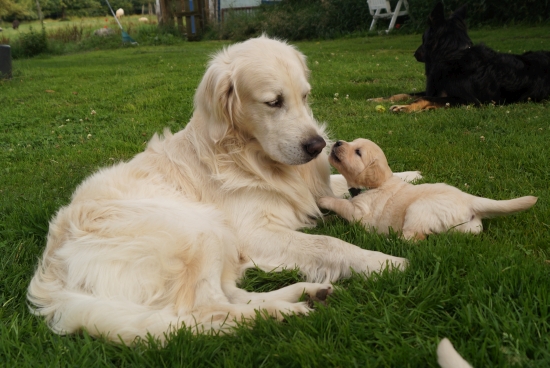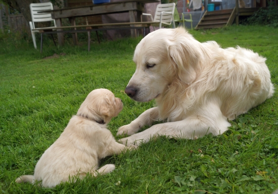 Mit vier Wochen nehmen die Welpen jetzt zunehmend ihre Umwelt wahr - Zeit, ihren Vater kennenzulernen.