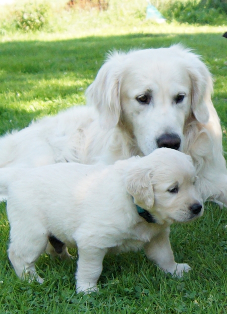 Mit vier Wochen nehmen die Welpen jetzt zunehmend ihre Umwelt wahr - Zeit, ihren Vater kennenzulernen.